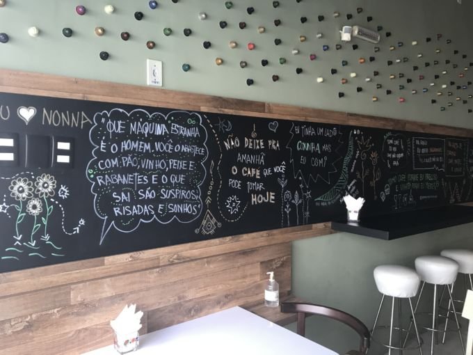 Somos recebidos com muita simpatia pelos sócios, em um ambiente super descontraído com frases na parede feitas à mão com giz, peças de artesanatos feitas por uma das sócias…