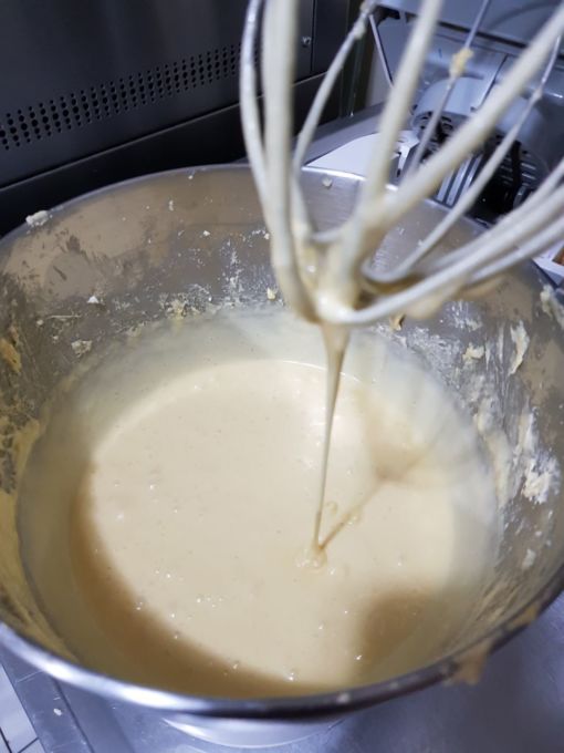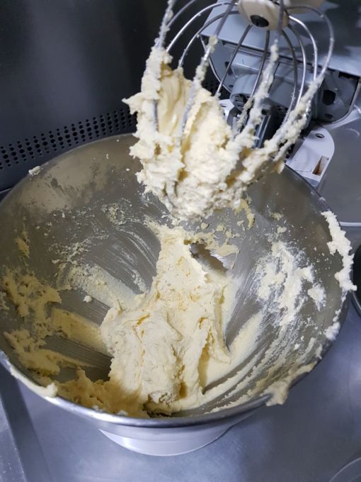 3) Acrescente os ovos na batedeira, um a um, até que se misturem. Novamente raspe o bowl para tirar a manteiga grudada nas laterais. Bata de 8 a 10 minutos em velocidade alta.