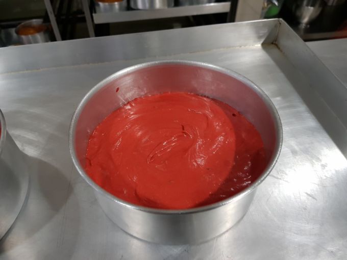 1) Hora de preparar o espaço de trabalho. Meça todos os ingredientes e preaqueça o forno em 180°C. Unte as formas com spray desmoldante (2 formas redondas de 18x7cm (diametro x altura). Misture o vinagre e o leite, e reserve. Misture o corante com o iogurte, separe. Misture todos os ingredientes secos (F. trigo, fermento, cacau), passe na peneira e guarde separadamente.